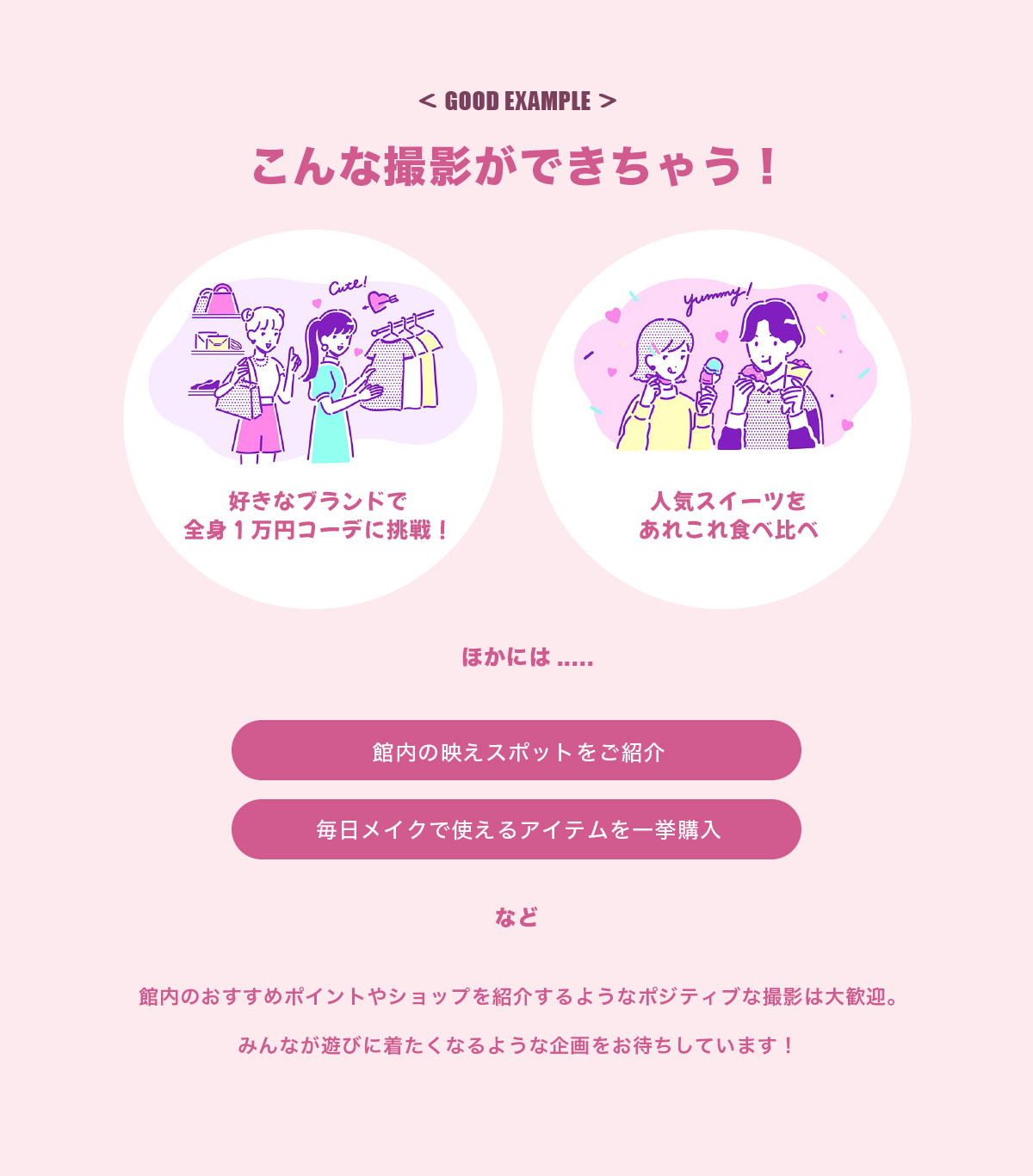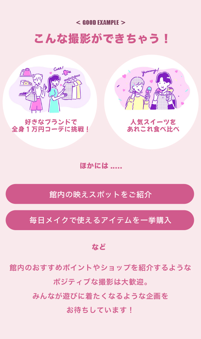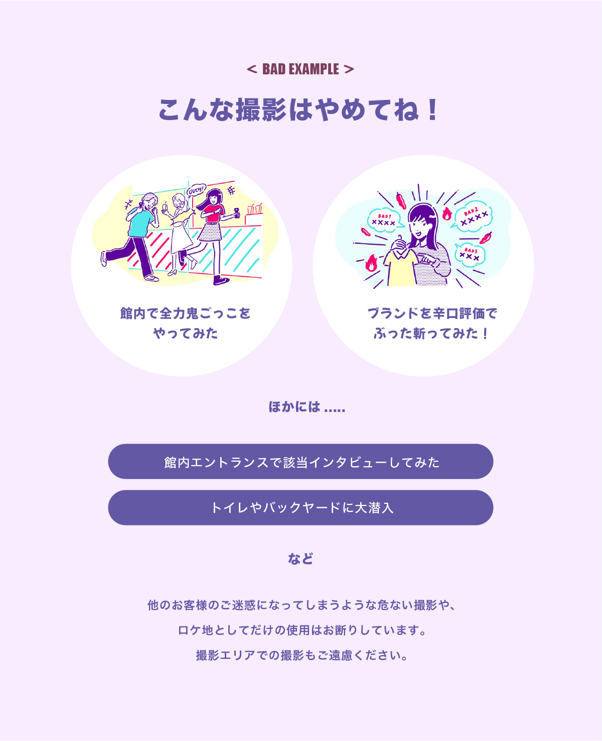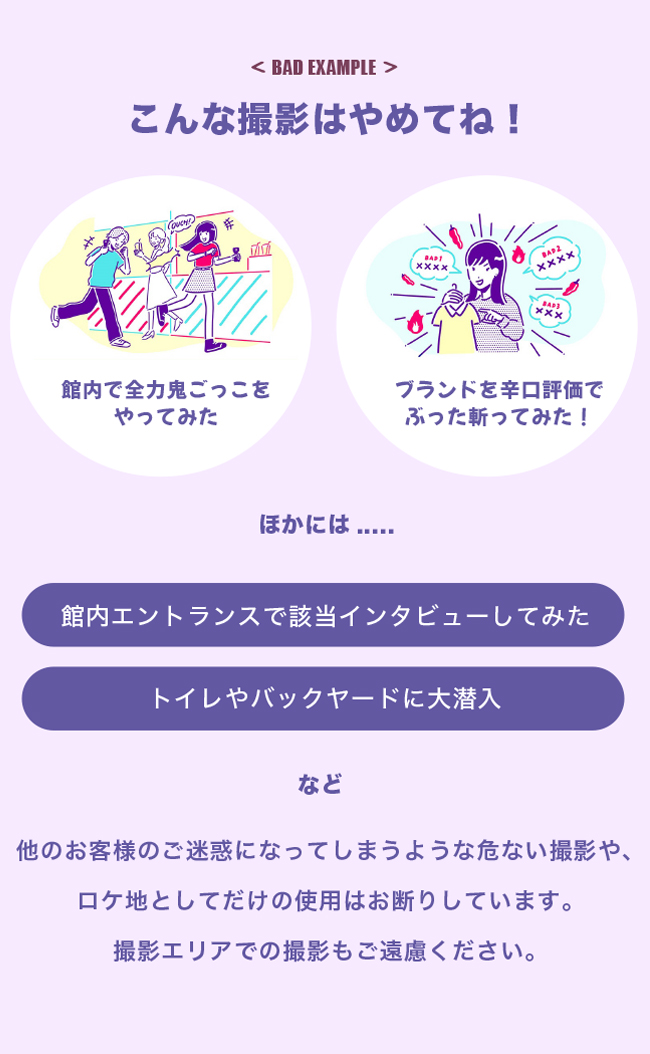 混雑や人だかりにより一般のお客様のご迷惑となるような場合は、撮影途中であっても中止させていただきます。