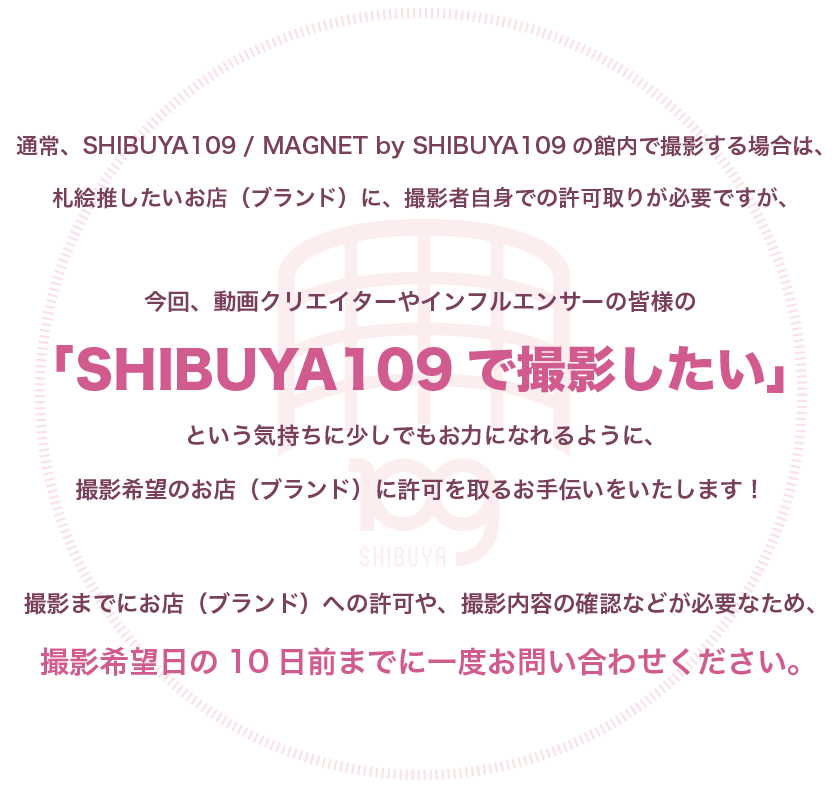 このページ内の「SHIBUYA109」とは「SHIBUYA109 渋谷店」「MAGNET by SHIBUYA109」を対象としており、阿倍野店は含みません。