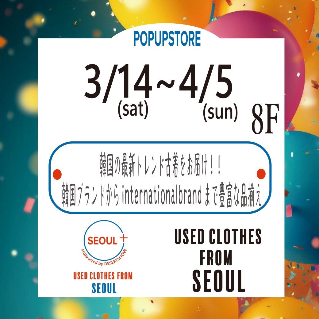 期間:3/14~4/5 フロア:8F 最新の韓国トレンドブランド&インターナショナルブランド古着を韓国よりお届け! 様々なブランド古着を取り揃えているので、 古着選びやファッションの楽しさを体感できるショップ。