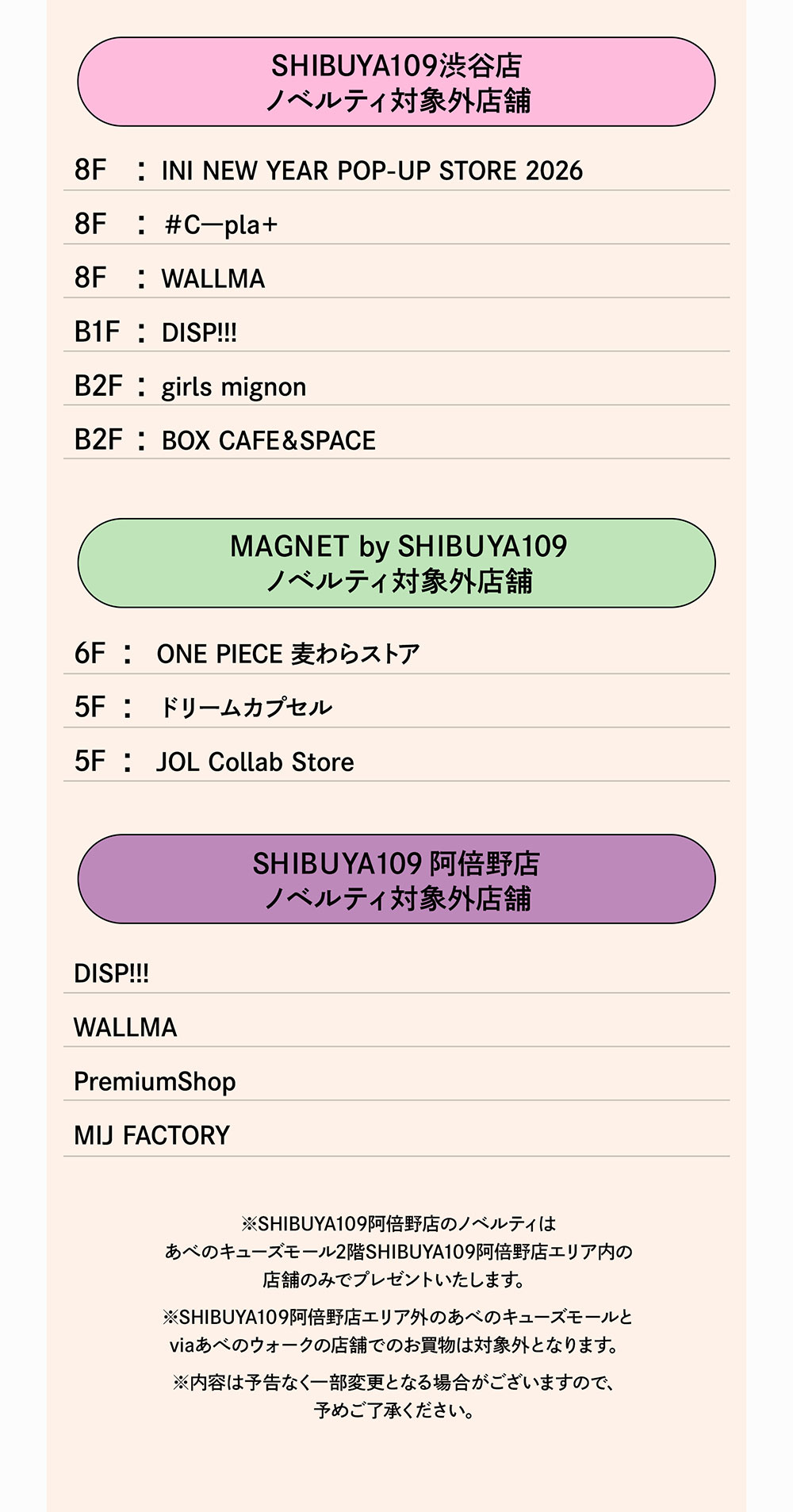 SHIBUYA109 x INI WINTER SALEノベルティ対象外店舗
